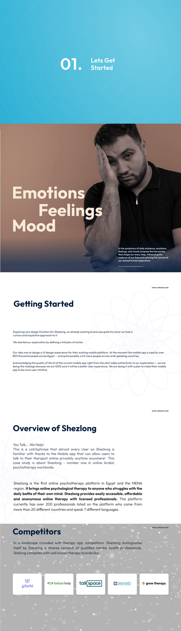Reimagining and renovating Shezlong platform. Shezlong is the first online psychotherapy platform in Egypt and the MENA region. It brings online psychological therapy to anyone who struggles with the daily battle of their own mind.