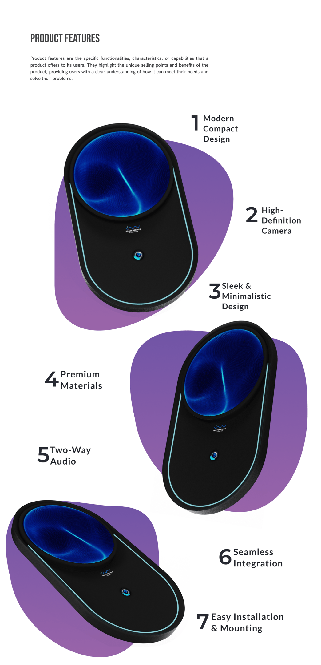 WinterWinds Robotics smart security camera project: a cutting-edge solution designed to safeguard homes, offices, and various indoor/outdoor spaces. With a focus on user-friendliness and seamless mounting, this sleek and minimal camera combines state-of-the-art technology with a unique design aesthetic, ensuring both security and style effortlessly blend into any environment.